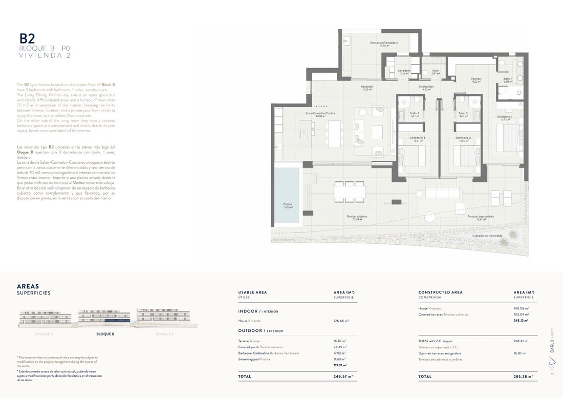 Consta de 8 exclusivas viviendas distribuidas a lo largo de la ladera de Benicassim con impresionantes vistas al mar. Cada vivienda se distribuye en 3 dormitorios dobles, todos con baño en-suite y el principal con vestidor. El amplio salón contemporáneo está abierto a una hermosa cocina de alta calidades y se fusiona con una terraza de 60m2. Todas y cada una de las viviendas disponen de piscina privada y cocina exterior, lo que hace que el complejo sea único y nos permite disfrutar plenamente del estilo de vida mediterráneo y pasando el maximo tiempo al aire libre. Todas las viviendas están diseñadas para aprovechar al máximo las realmente asombrosas vistas panorámicas al mar y la fantástica orientación al sol tanto en verano como en invierno.