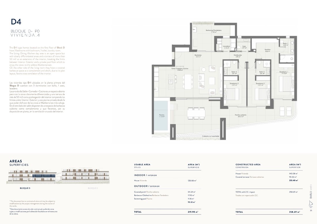Consta de 8 exclusivas viviendas distribuidas a lo largo de la ladera de Benicassim con impresionantes vistas al mar. Cada vivienda se distribuye en 3 dormitorios dobles, todos con baño en-suite y el principal con vestidor. El amplio salón contemporáneo está abierto a una hermosa cocina de alta calidades y se fusiona con una terraza de 60m2. Todas y cada una de las viviendas disponen de piscina privada y cocina exterior, lo que hace que el complejo sea único y nos permite disfrutar plenamente del estilo de vida mediterráneo y pasando el maximo tiempo al aire libre. Todas las viviendas están diseñadas para aprovechar al máximo las realmente asombrosas vistas panorámicas al mar y la fantástica orientación al sol tanto en verano como en invierno.