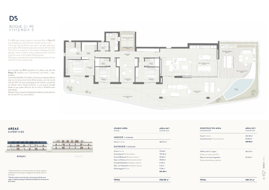 Consta de 8 exclusivas viviendas distribuidas a lo largo de la ladera de Benicassim con impresionantes vistas al mar. Cada vivienda se distribuye en 3 dormitorios dobles, todos con baño en-suite y el principal con vestidor. El amplio salón contemporáneo está abierto a una hermosa cocina de alta calidades y se fusiona con una terraza de 60m2. Todas y cada una de las viviendas disponen de piscina privada y cocina exterior, lo que hace que el complejo sea único y nos permite disfrutar plenamente del estilo de vida mediterráneo y pasando el maximo tiempo al aire libre. Todas las viviendas están diseñadas para aprovechar al máximo las realmente asombrosas vistas panorámicas al mar y la fantástica orientación al sol tanto en verano como en invierno.