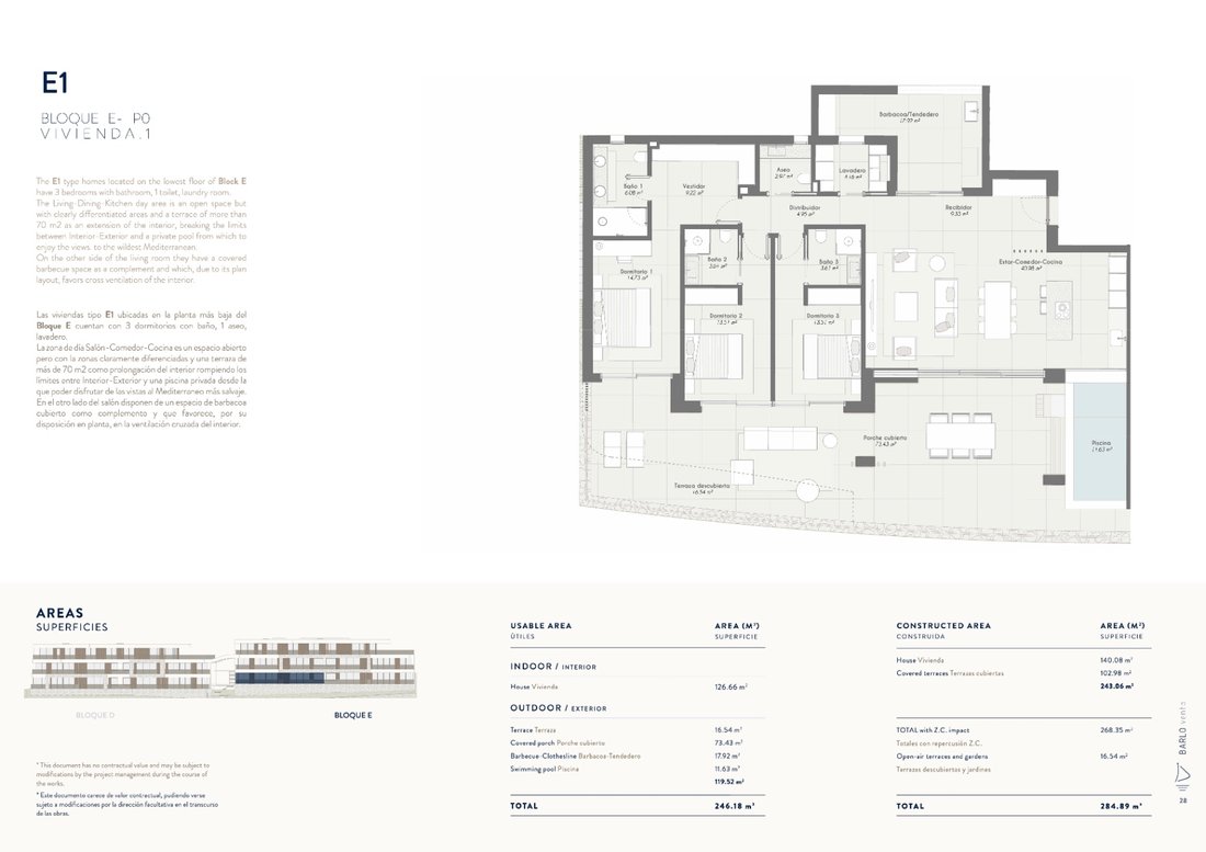 Consta de 8 exclusivas viviendas distribuidas a lo largo de la ladera de Benicassim con impresionantes vistas al mar. Cada vivienda se distribuye en 3 dormitorios dobles, todos con baño en-suite y el principal con vestidor. El amplio salón contemporáneo está abierto a una hermosa cocina de alta calidades y se fusiona con una terraza de 60m2. Todas y cada una de las viviendas disponen de piscina privada y cocina exterior, lo que hace que el complejo sea único y nos permite disfrutar plenamente del estilo de vida mediterráneo y pasando el maximo tiempo al aire libre. Todas las viviendas están diseñadas para aprovechar al máximo las realmente asombrosas vistas panorámicas al mar y la fantástica orientación al sol tanto en verano como en invierno.