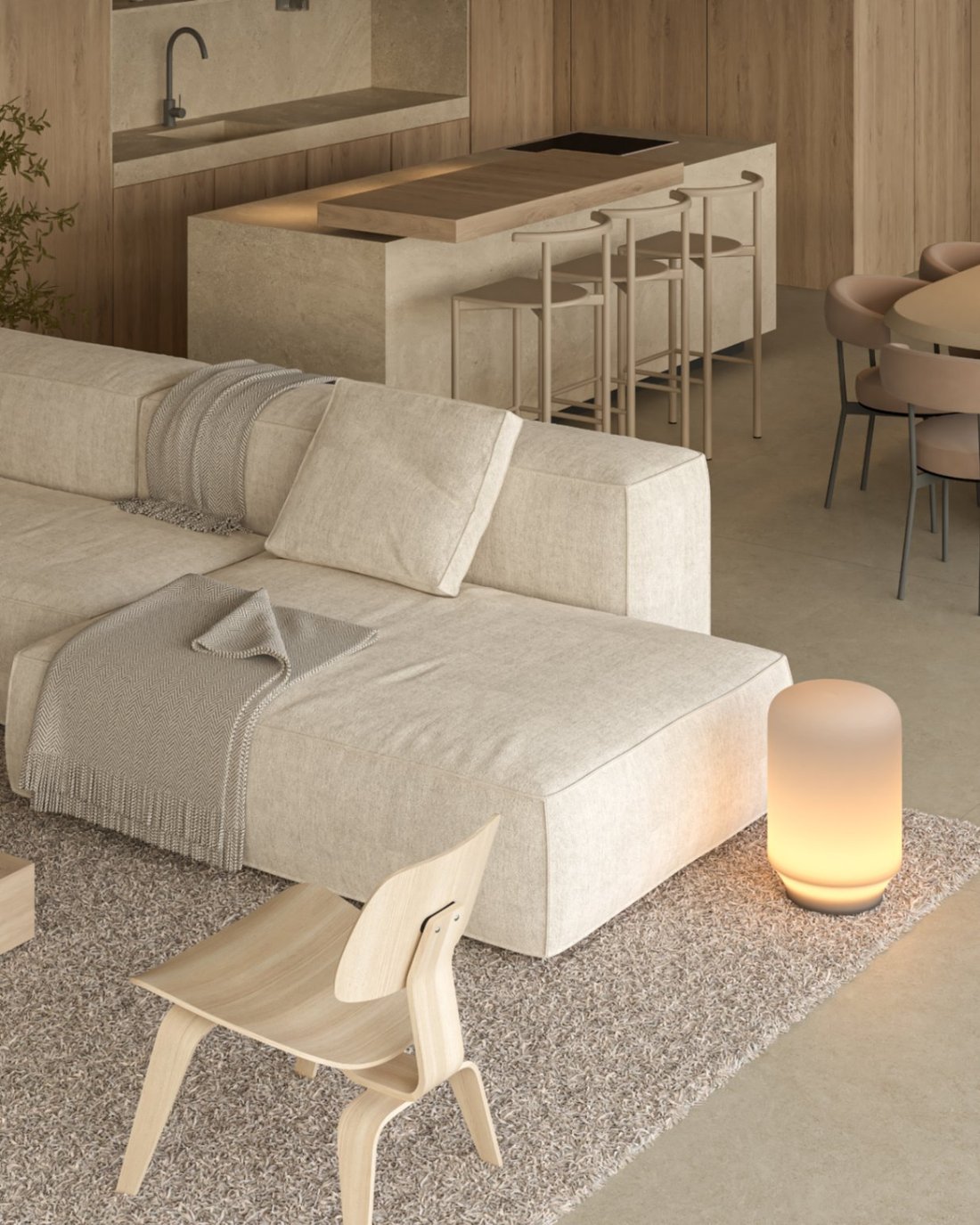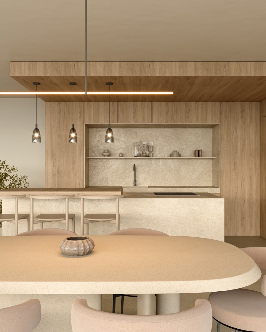 PLANTA BAJA: Amplia sala de estar iluminada junto a la cocina abierta con isla, un aseo de invitados y un dormitorio con baño en suite. En el exterior, encontramos la deslumbrante piscina infinity, rodeada por una amplia terraza y la zona de barbacoa.