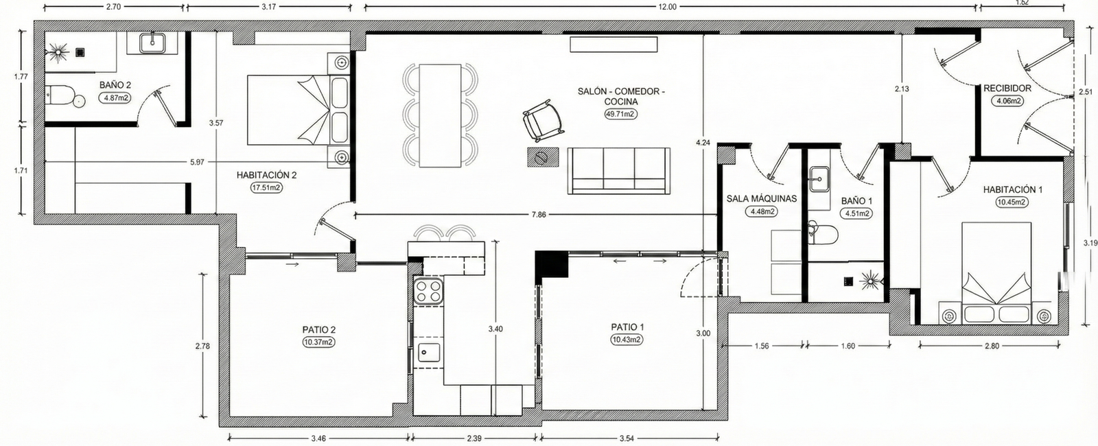 ¿Cabe una mesa grande en el salón? Absolutamente. Con 49.71 m², puedes colocar una zona de sofás en “L”, una mesa de comedor para 8-10 personas y aún te sobrará espacio para una isla de cocina o rincón de lectura.