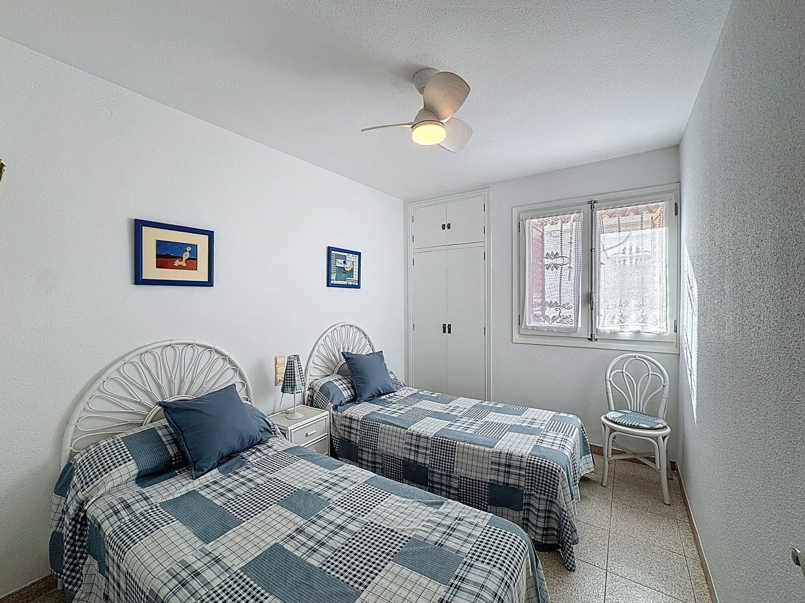 Subiendo a la zona privada, encontramos las 3 habitaciones. A diferencia de los apartamentos turísticos construidos en los años 70 y 80 que solían tener habitaciones “camarote”, aquí encontramos dormitorios dobles. Esto es vital si planeas que la casa sea un punto de reunión familiar; hay espacio real para camas grandes o literas sin sensación de agobio. El baño completo da servicio a estas estancias con comodidad.